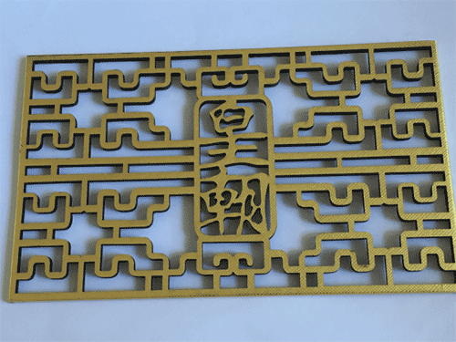 4. 將產(chǎn)品正面朝上放置在切割機上,金鉑紙面為正面,要求不能有白邊,發(fā)黃,發(fā)黑等現(xiàn)象,激光鏤空后用汽槍將灰塵吹干凈,不能吹太重。生產(chǎn)首件交由品管確認OK后再進行批量生產(chǎn)。